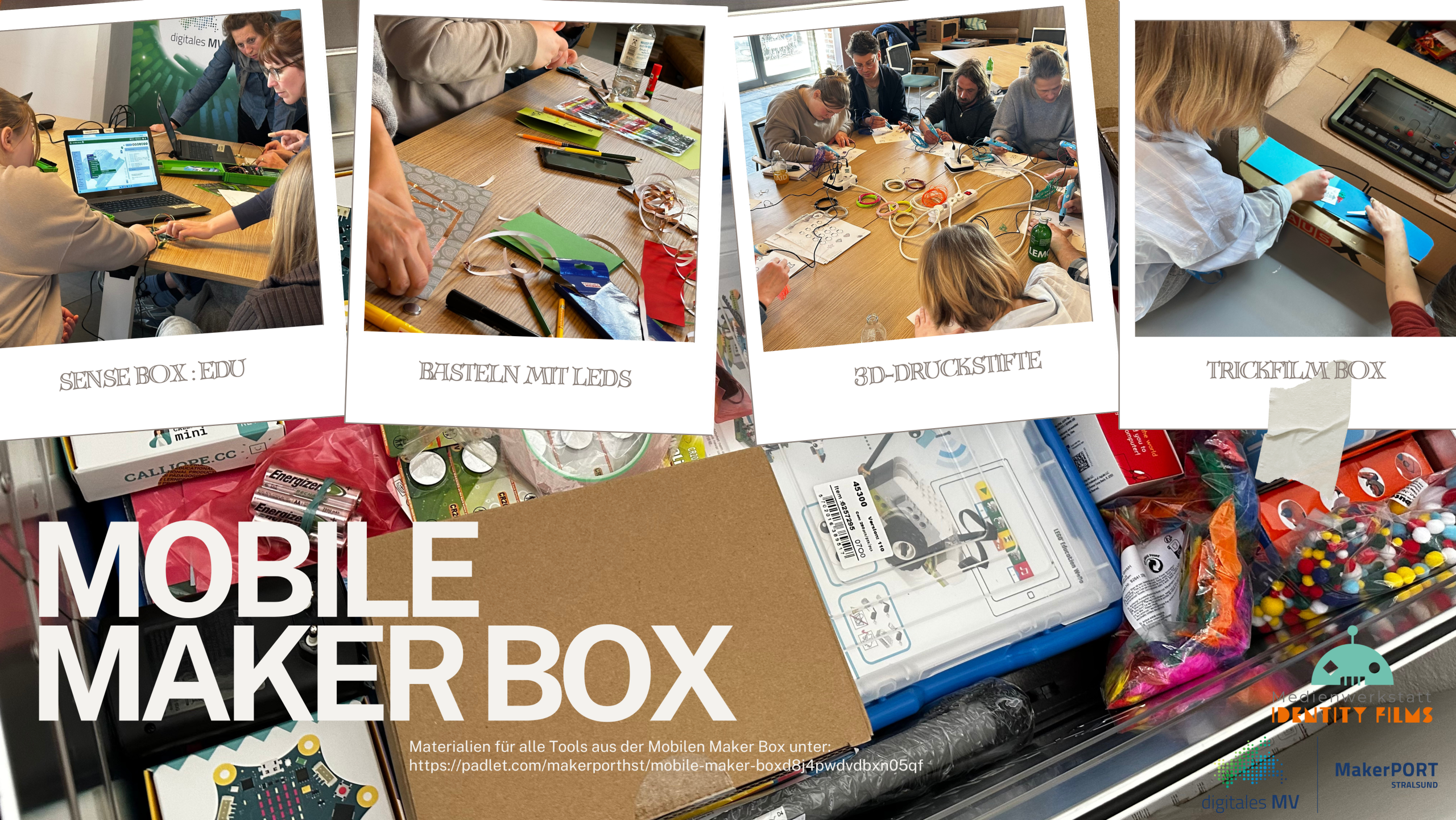 Mit den mobilen Maker Boxen fördern wir Kinder und Jugendliche im ländlichen Raum Vorpommern-Rügen. Das Projekt bietet einen niedrigschwelligen Einstieg in nachhaltige MINKT-Bildungsarbeit, stärkt digitale Kompetenzen, Kreativität und Selbstwirksamkeit und trägt zum Abbau von Bildungsungleichheiten bei. Zu den Materialien.