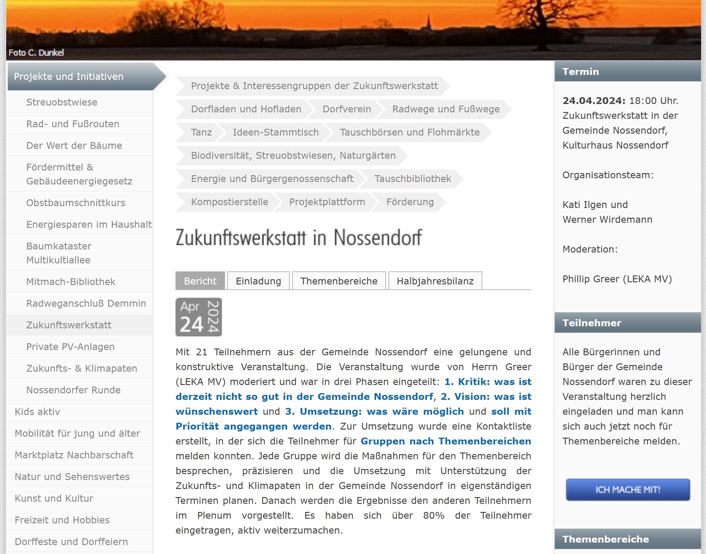 NossendorferThemen.de ist die Plattform für engagierte Bürgerinnen und Bürger und Drehscheibe ehrenamtlicher Aktivitäten. Sie bündelt Infos zum vielfältigen Landleben und bietet digitale Beteiligung: „Wer macht was?“, Ideen vorschlagen, Termine, Besprechungsräume buchen u. v. m. So entsteht Transparenz, Vernetzung und Mitwirkung – digital unterstützt, lokal wirksam.